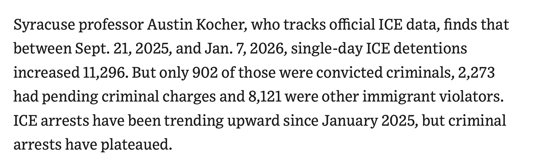 As a matter of total numbers, the following graph reinforces the findings above by showing an increase in the total numbers of people in detention arrested by ICE. The total number of immigrants detained by ICE with criminal convictions has not increased at all since August, and has not increased more than marginally since March 2025. In fact, since mid-December, the total number of detained people with convictions has actually decreased and may soon be overtaken by people with only pending criminal charges.