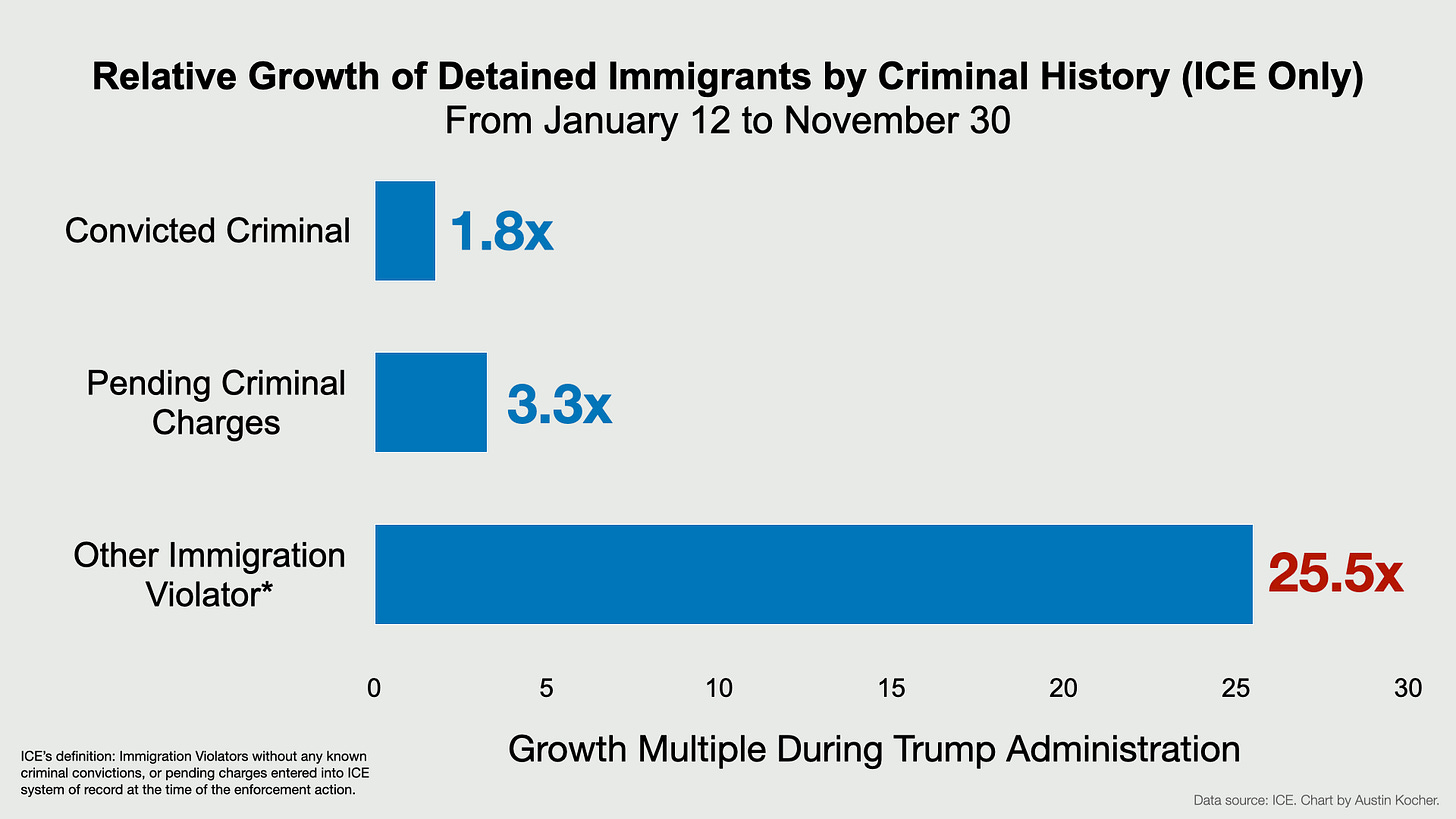 ICE arrests declined a bit in November based on this data. I broke down the latest Deportation Data Project data on Wednesday. Estimates from that data show about 34,400 ICE arrests for October, so this tracks.1 Just to answer a question before I get it: arrests and detention numbers do not necessarily correlate on a monthly basis due to a variety of factors, including average length of stays in detention. I wrote a Substack post about this in 2021 that is still relevant, so check that out: “Understanding Detention Numbers.”