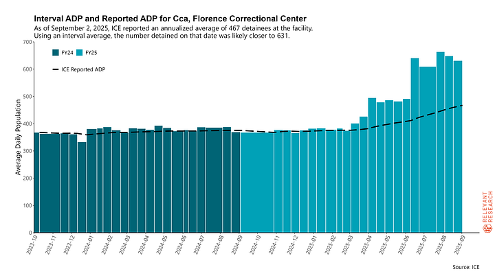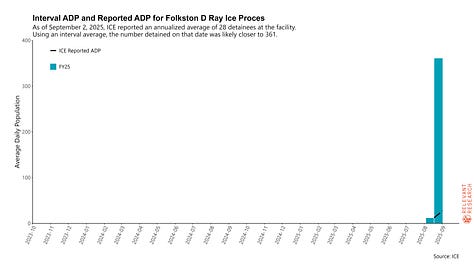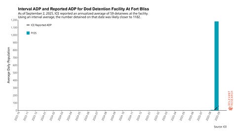 The Fort Bliss facility is particularly notable as we’ve previously documented its role in detention operations.at that facility, that the Tien population has gone from zero to over 1000 in between the two detention data releases. Read the latest reporting on Fort Bliss from CBS News here: “New West Texas immigration detention facility is a giant tent city.”