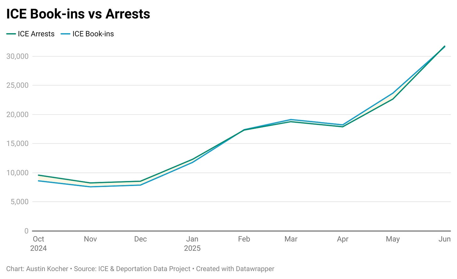 I want people to remain aware that from a definitional perspective, arrests and book-ins are not necessarily the same thing, even if they approximate closely enough to be used interchangeably for current analysis. The relationship between these metrics could change over time, particularly if ICE policies shift toward different custody arrangements or if capacity constraints force changes in detention practices.