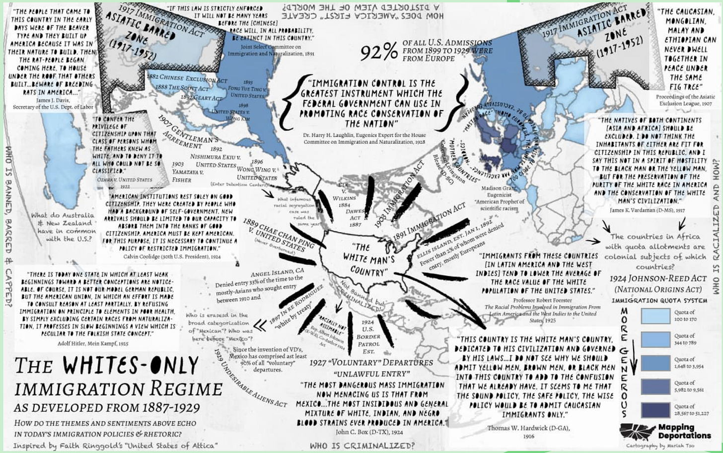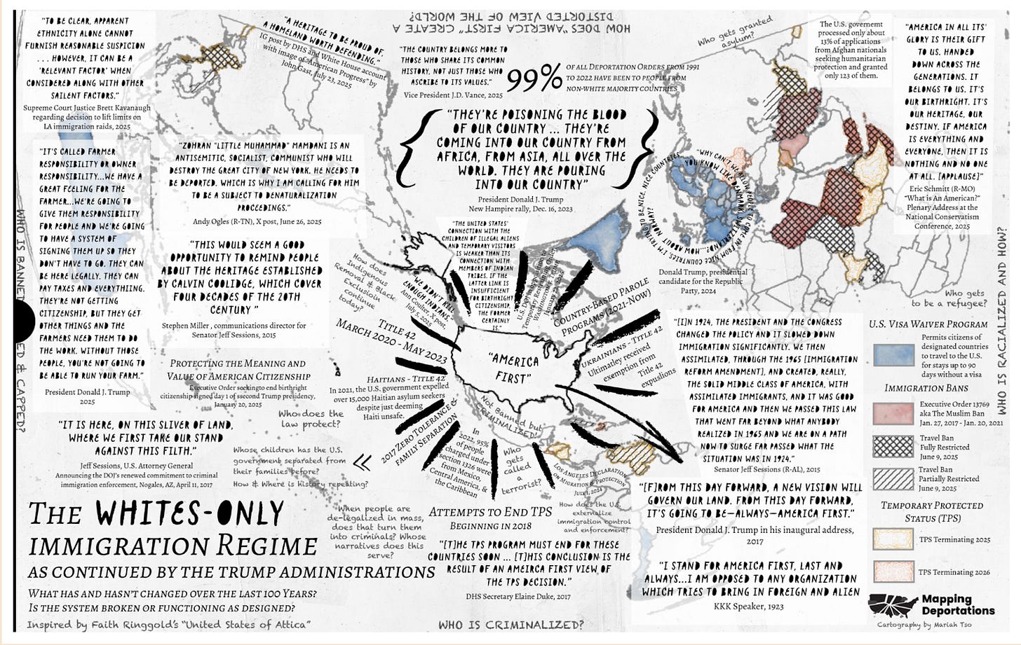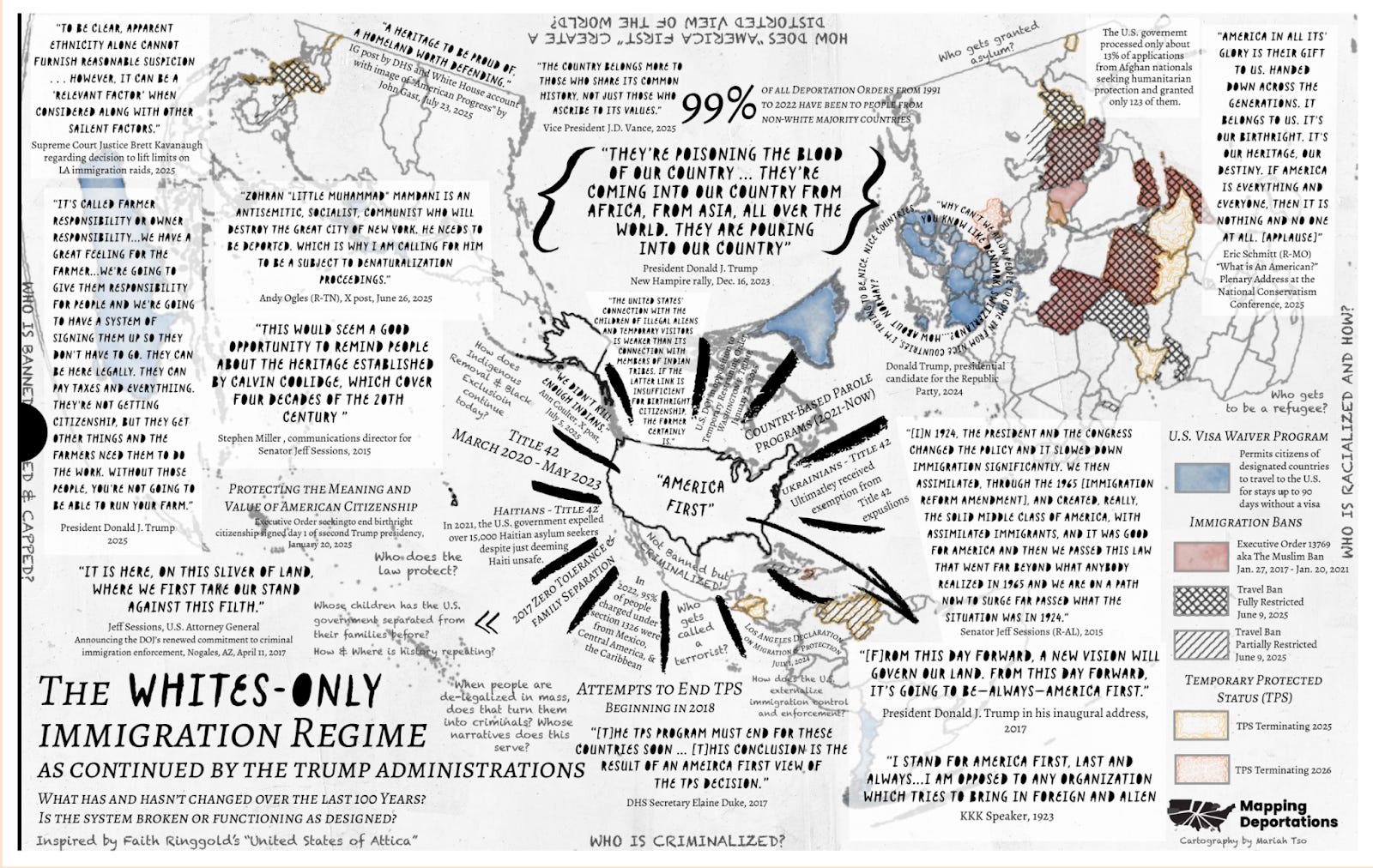 The artistically re-imagined maps below showcases more than a century of immigration ideology into a pair of unsettling images by pairing political quotes with policies that enacted them. Each statement highlights how U.S. leaders have repeatedly described non-white immigrants as threats to national identity, purity or security. The map exposes historical and contemporary rhetoric side by side by showcasing the links between Chinese exclusion act, The Muslim Ban and Title 42. These policies have functioned as tools to maintain the racial hierarchy. The map argues that whites-only immigration regimes did not end but has simply evolved into new legal forms that produce similar outcomes.