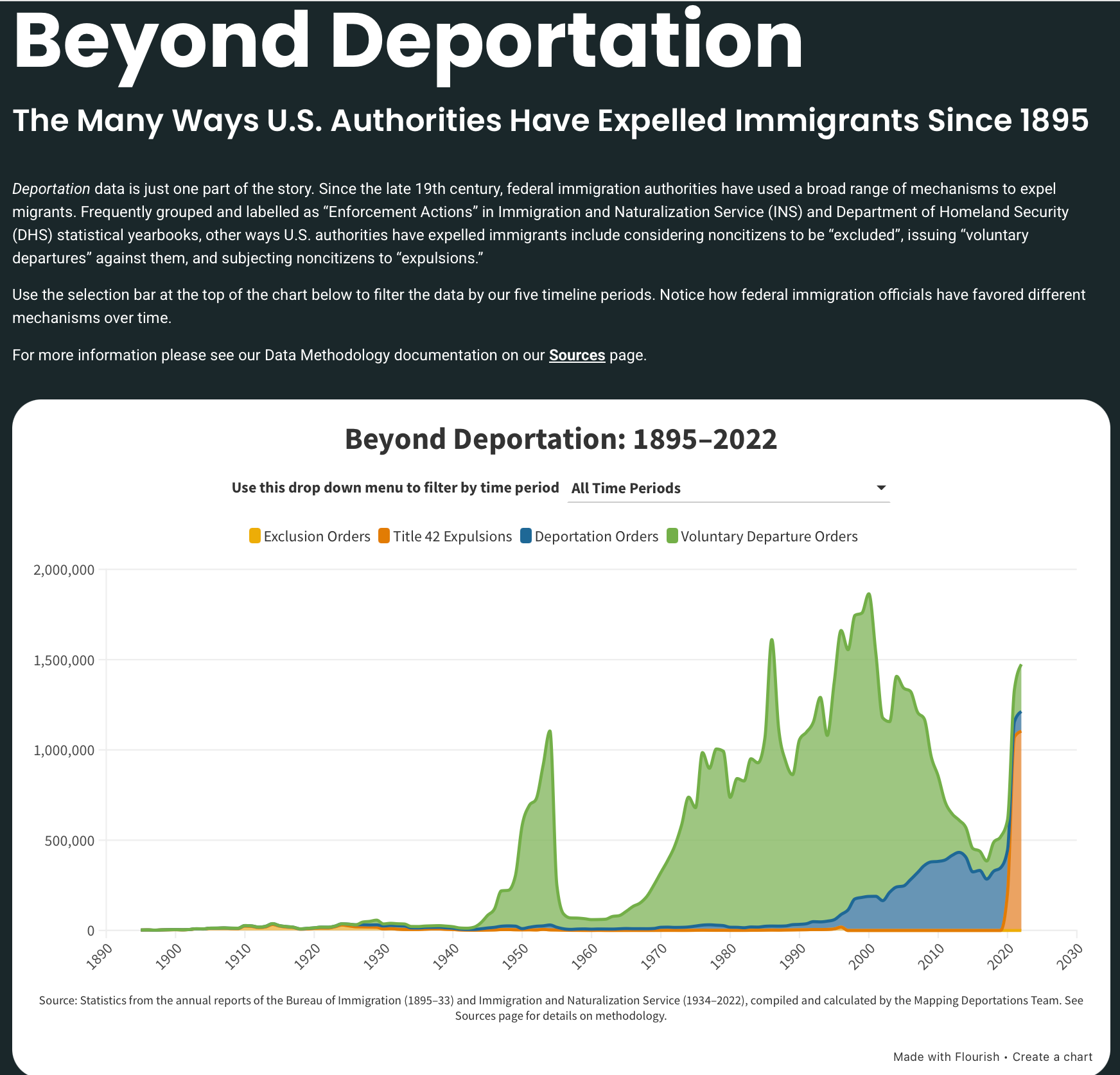 The project assembles archival documents, digitized deportation ledgers, visualizations of annual removal counts, and timelines tracing the evolution of immigration law from 1790 through the present. When read together, these sources reveal how deportation has always functioned as a tool for shaping national identity, maintaining racial hierarchy, and defining who belongs. The dataset covers more than eight million formal deportation orders and when voluntary departure and border expulsions are included, the dataset balloons to over 58 million removals.