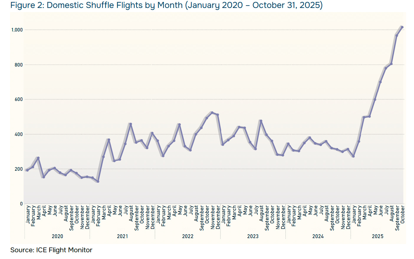 Like pretty much all enforcement metrics under this administration, the numbers are all record-breaking. Overall, the ICE Flight Monitor has documented over 10,672 total flights during the Trump administration so far. Most are those interior shuffle flights, but deportation flights are also well above previous highs. October alone saw a record 1,014 domestic shuffle flights—the highest on record—plus 199 deportation flights, which is above, but not quite as dramatically above, historic levels.