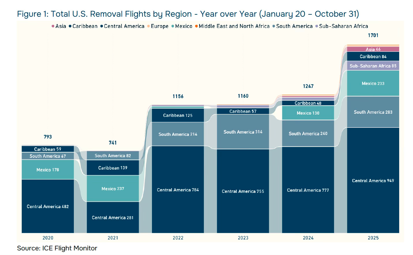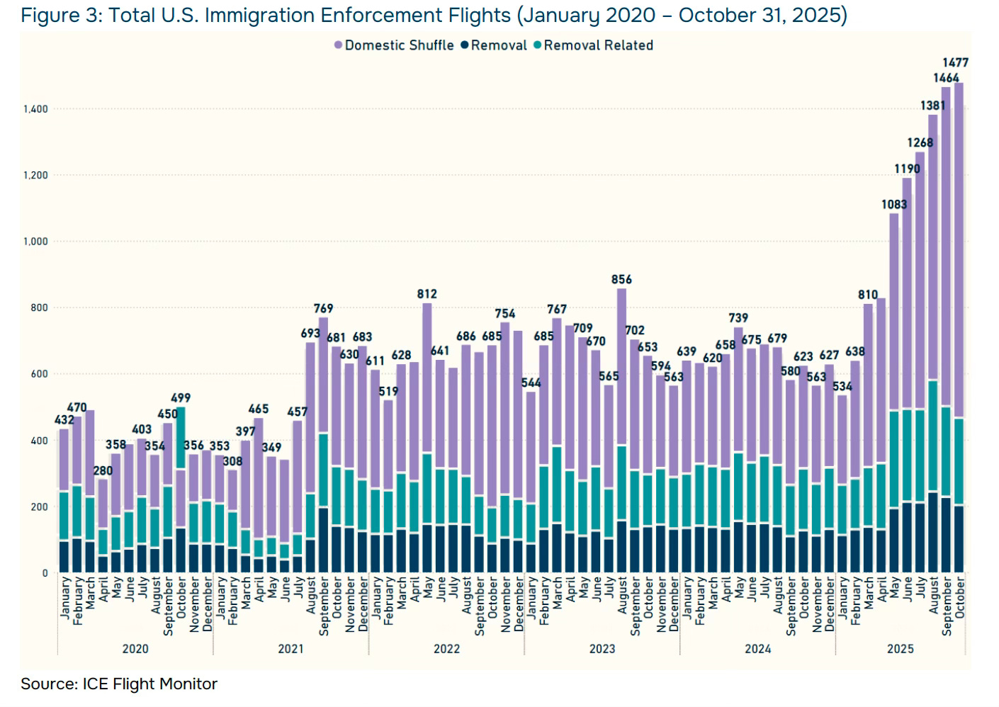 Human Rights First just released its latest ICE Flight Monitor report tracking deportation flights through October 2025. This project was originally started by Tom Cartwright over five years ago, and when Human Rights First absorbed it earlier this year, they took on one of the most important immigration data projects in our research ecosystem right now.